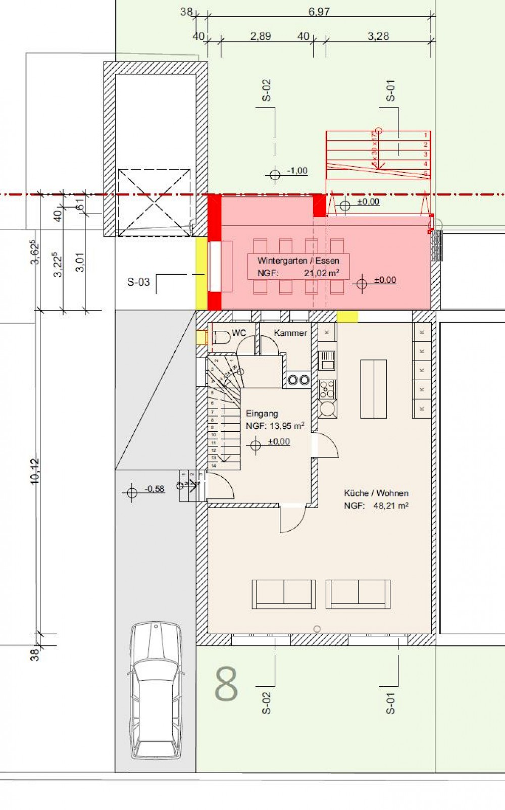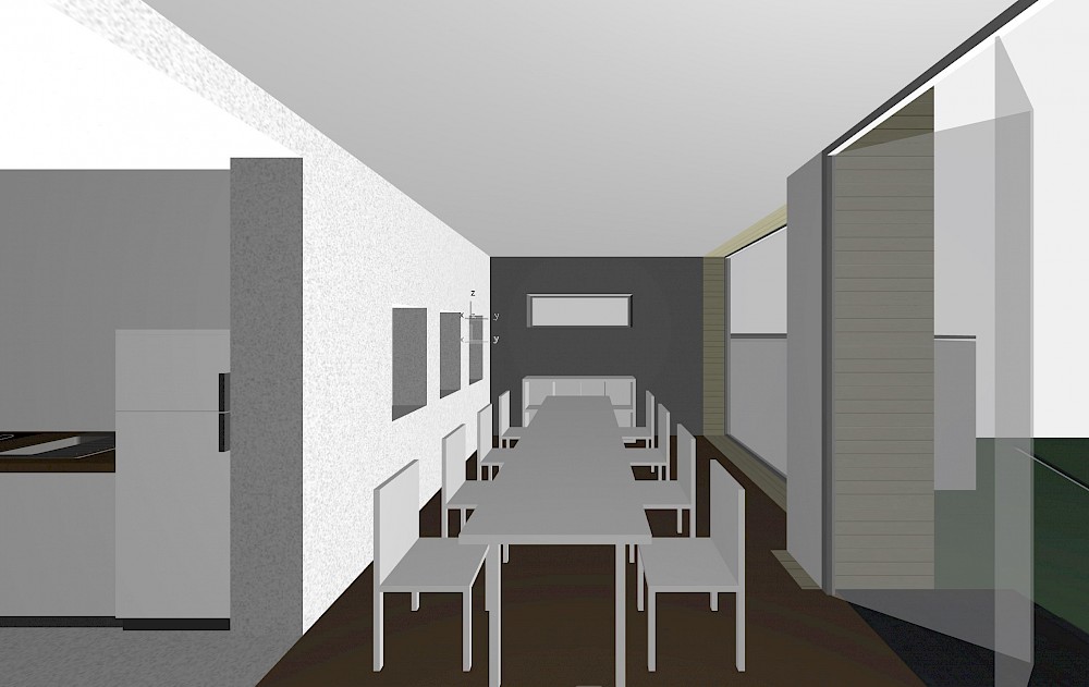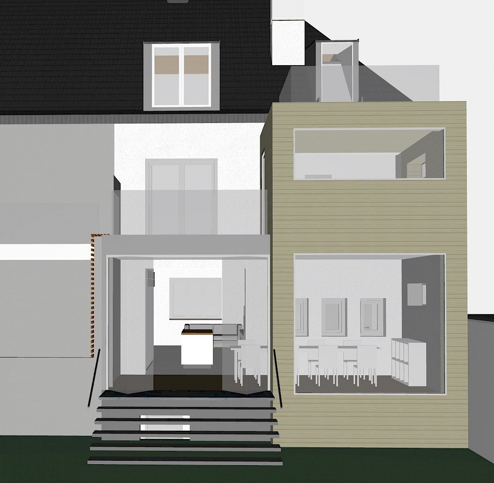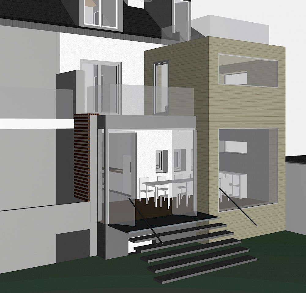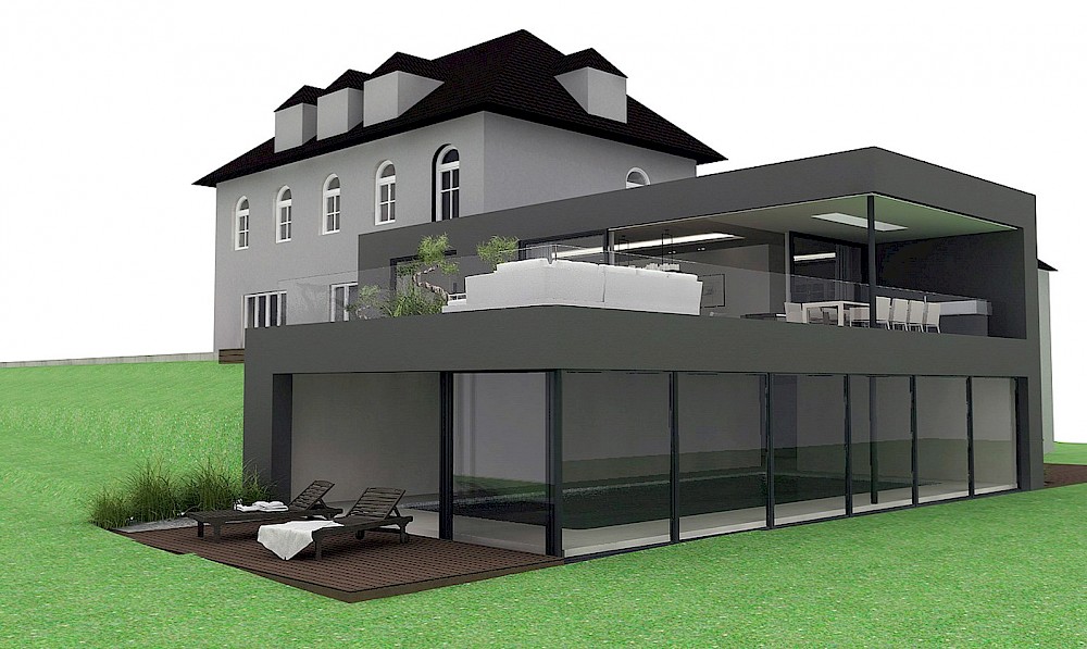 Das bestehende Gebäude wird auf der Nordseite im Erdgeschoss um einen Wintergarten / Essbereich und im Obergeschoss um 1 Kinderzimmer erweitert.