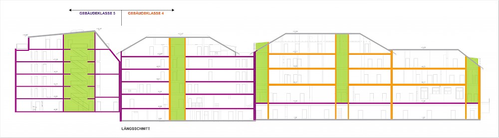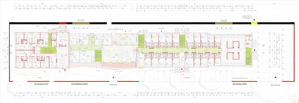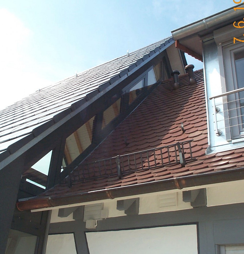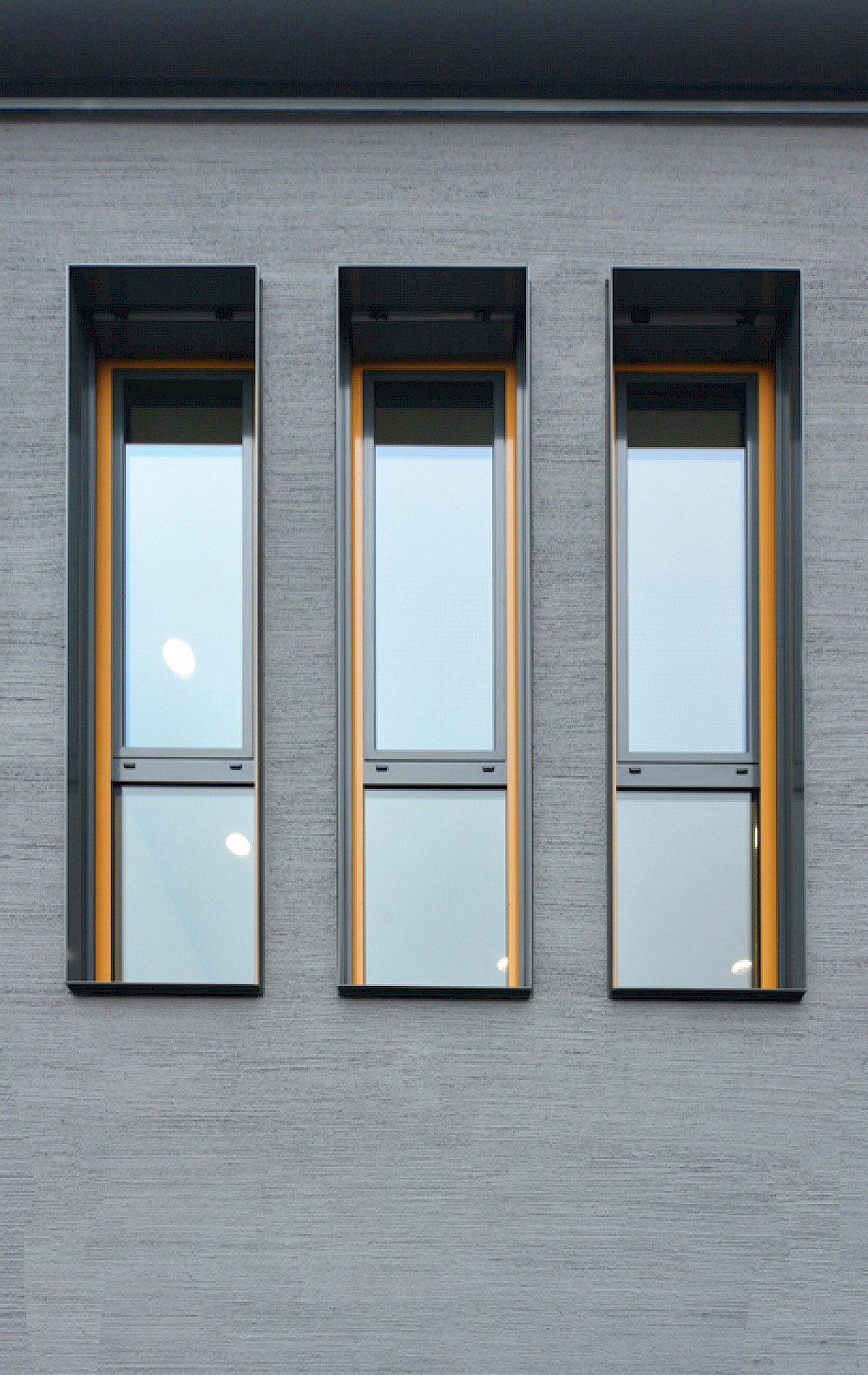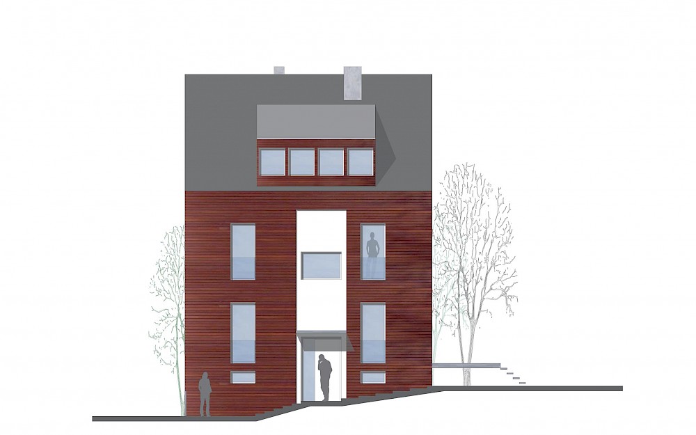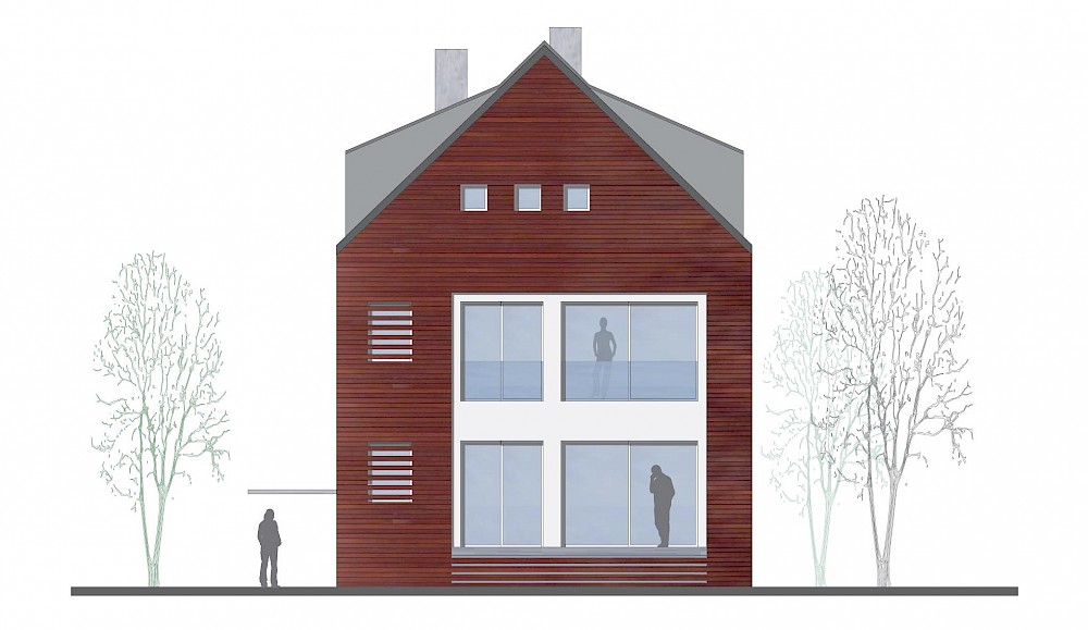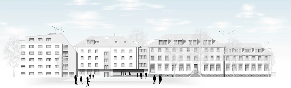 Der Neubau nimmt als Erweiterungsbau einerseits Elemente des vorhandenen Gebäudeteils auf (Fassadenfluchten, Höhenstaffelung, Dachform, Dachneigung, Traufhöhen),