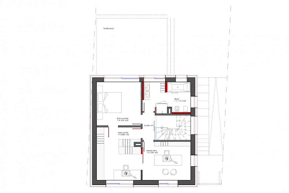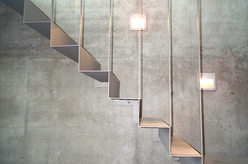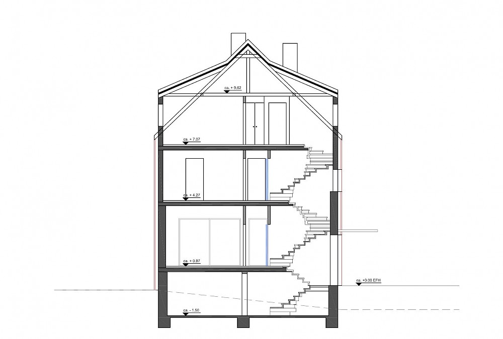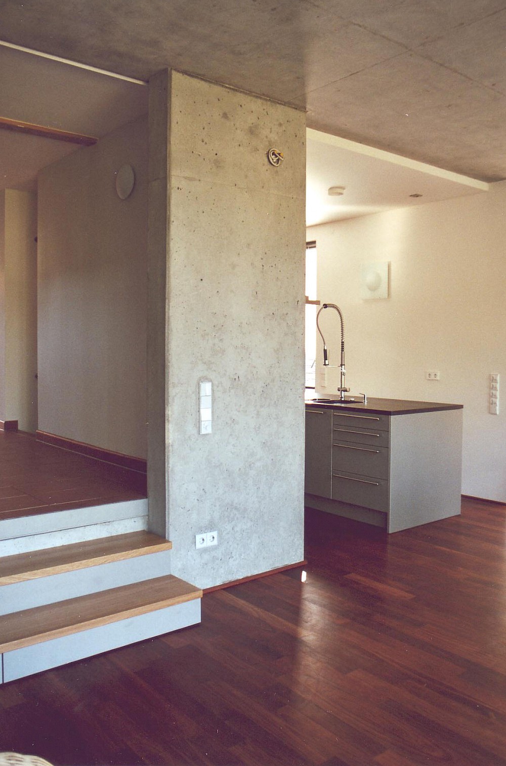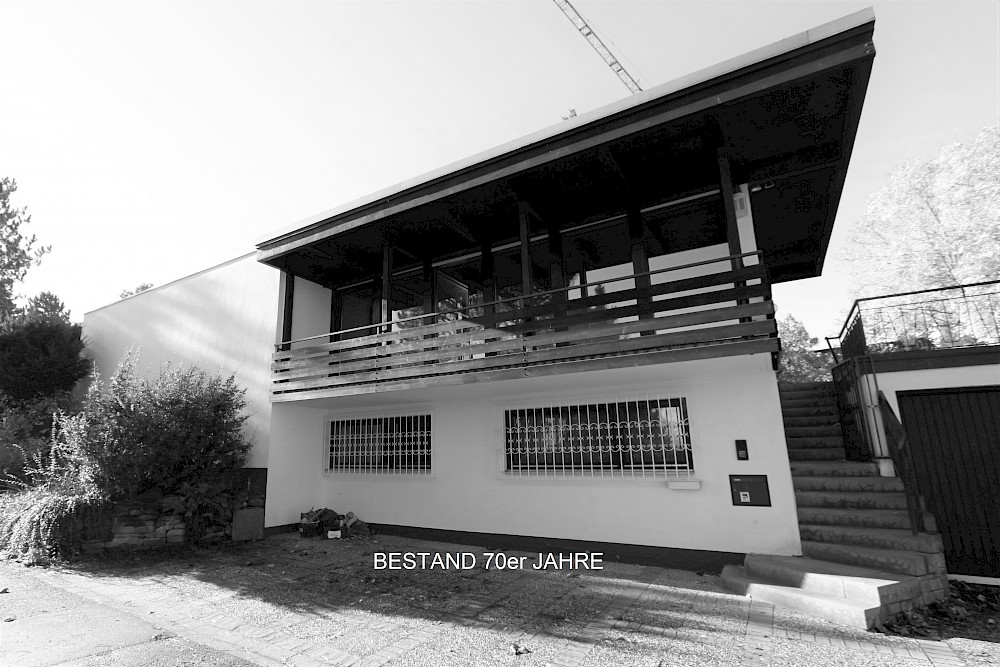 Der vorhandene Gebäudeteil wurde als Holzkonstruktion errichtet und ist der Hanglage entsprechend in vier halbgeschossige versetzte Geschossebenen gegliedert.