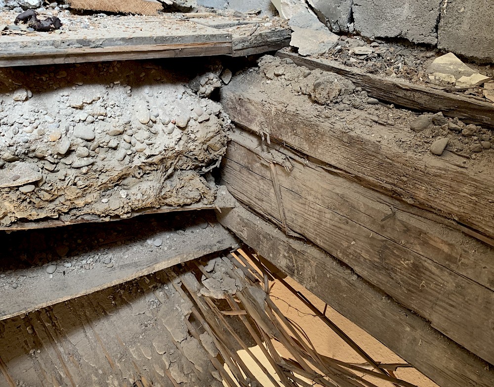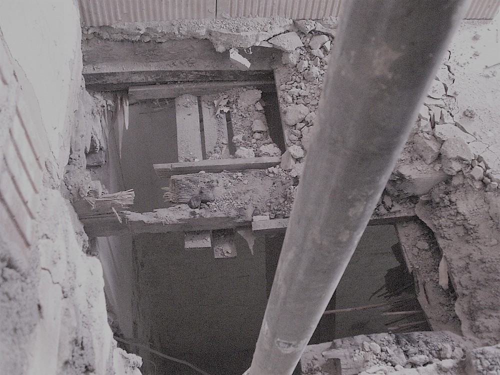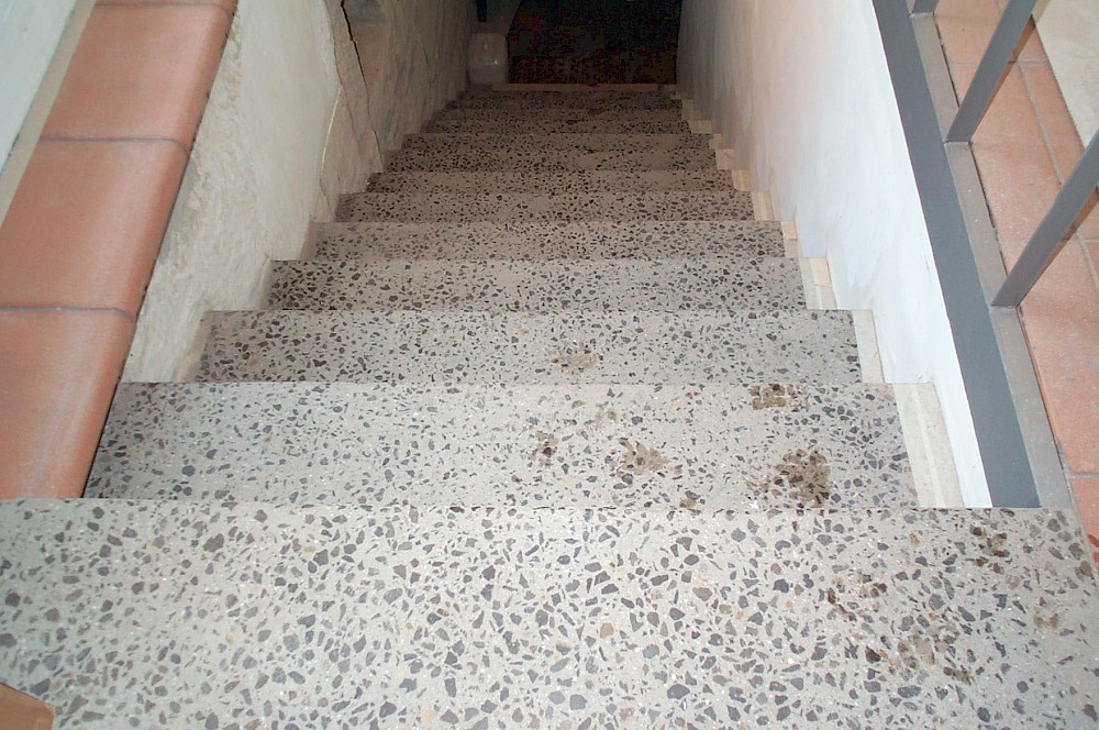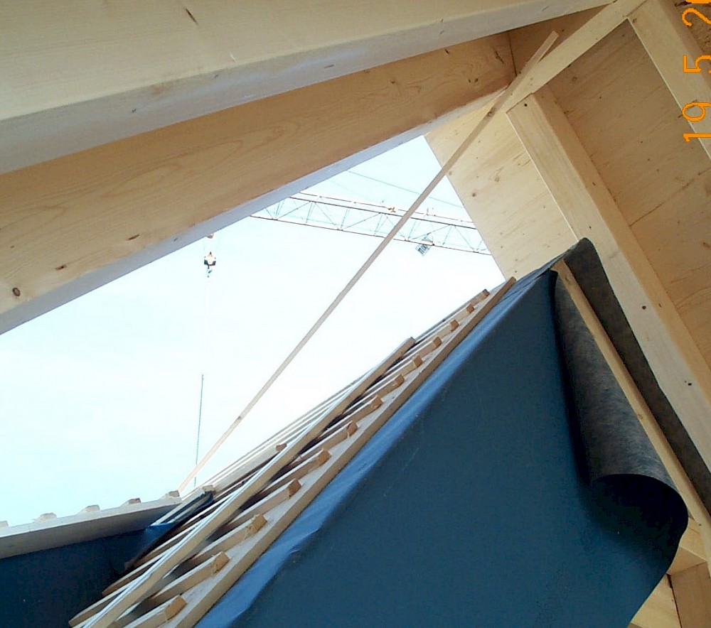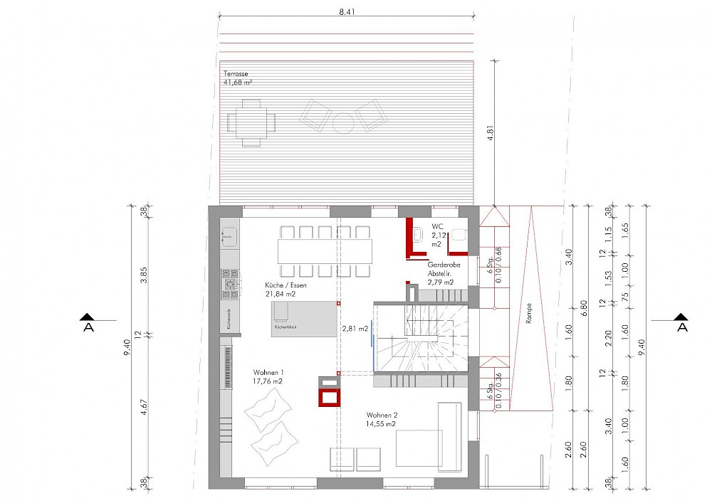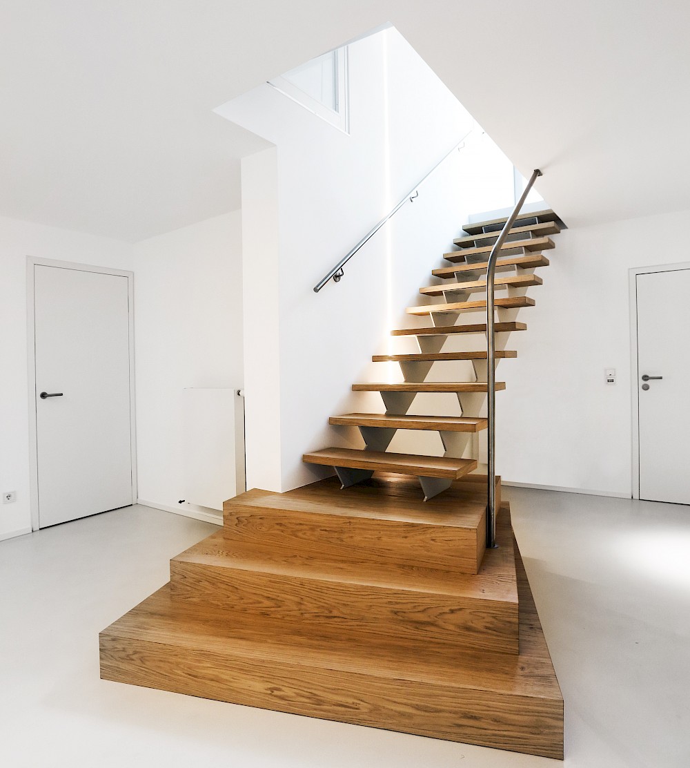 Der vorhandene Gebäudeteil wurde als Holzkonstruktion errichtet und ist der Hanglage entsprechend in vier halbgeschossige versetzte Geschossebenen gegliedert.