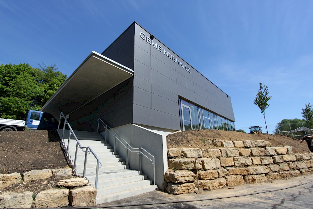 Die neue Gemeindehalle wird an Stelle des bestehenden Gemeindehauses errichtet. Die Gemeindehalle besteht aus einer großen Mehrzweckhalle über 2 Geschosse, einem Vereinsheim mit Gastronomieküche und Nebenräumen. Im Obergeschoss befinden sich die Sanitärräume für die Sportler und die Vereinsräume.