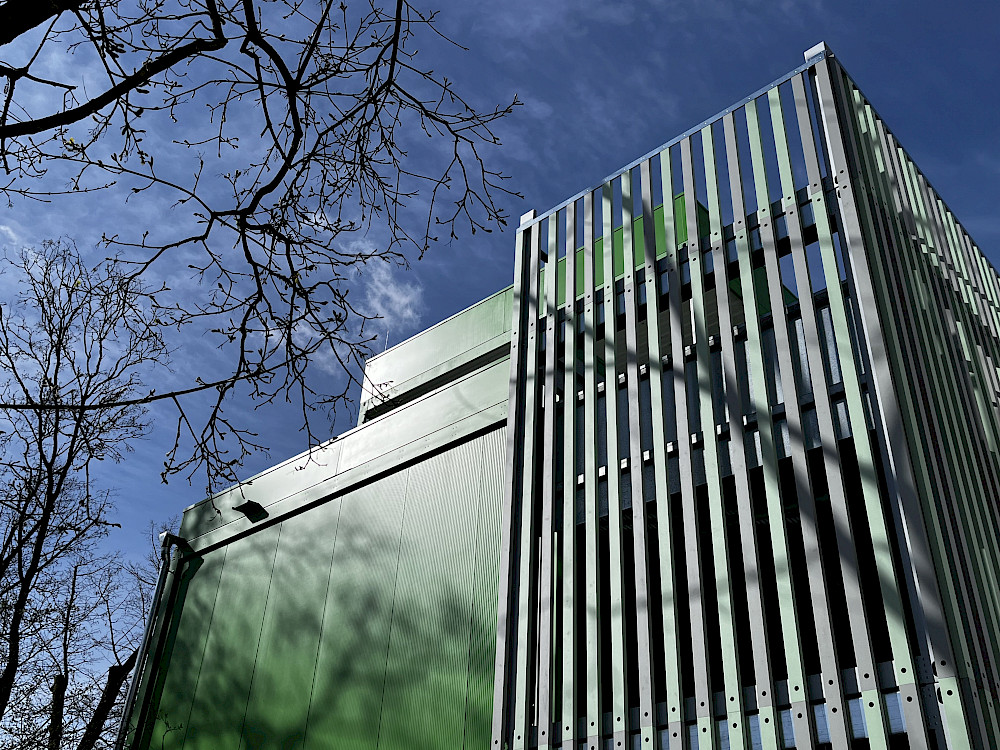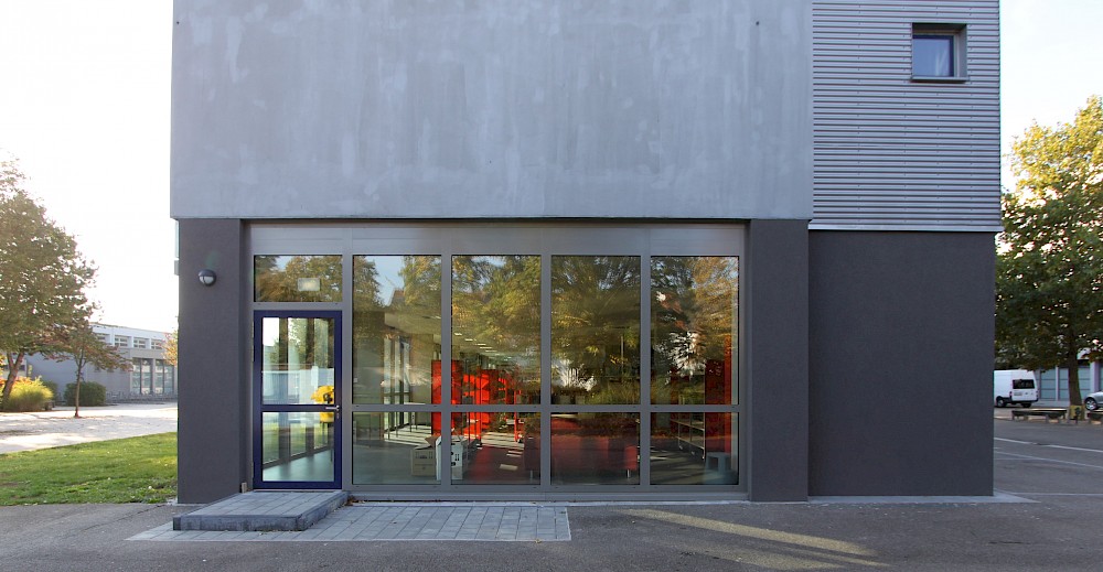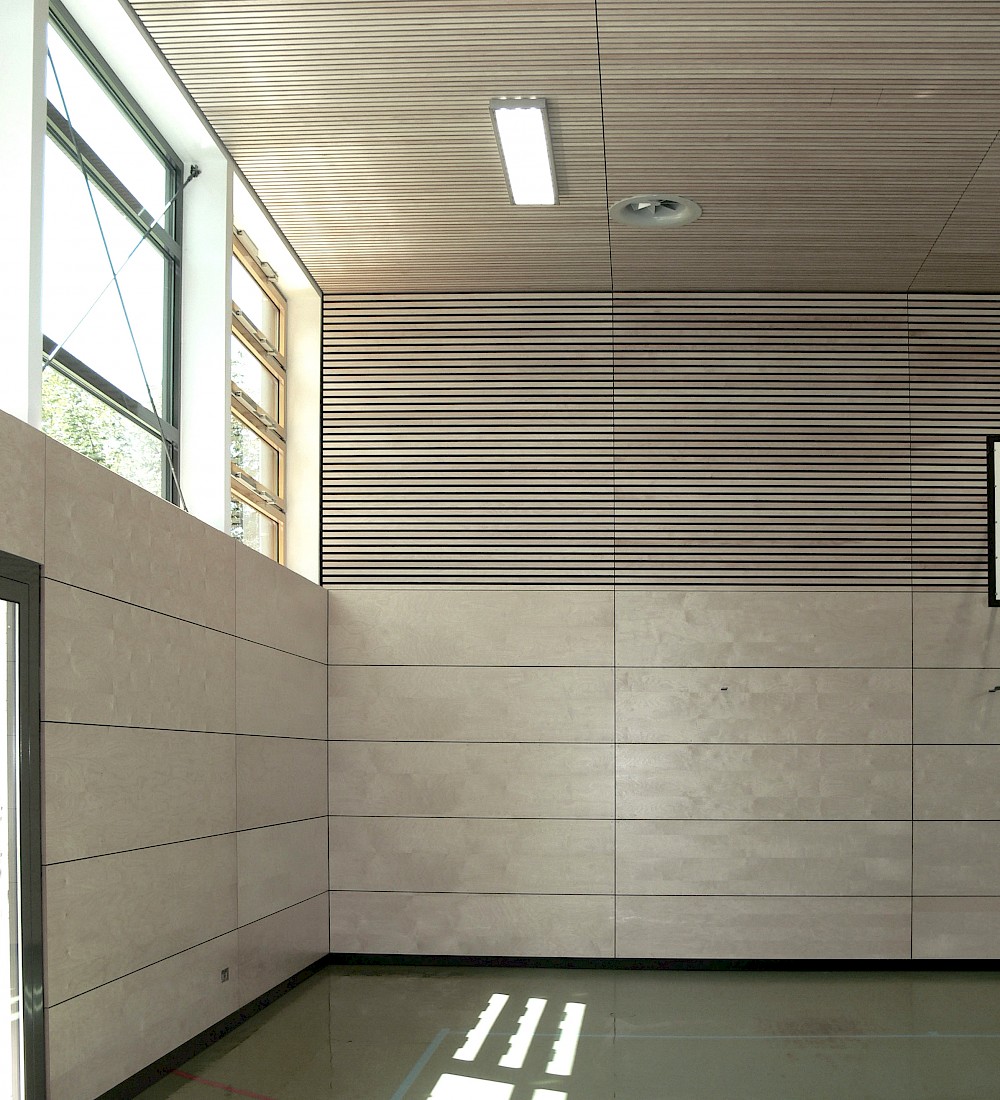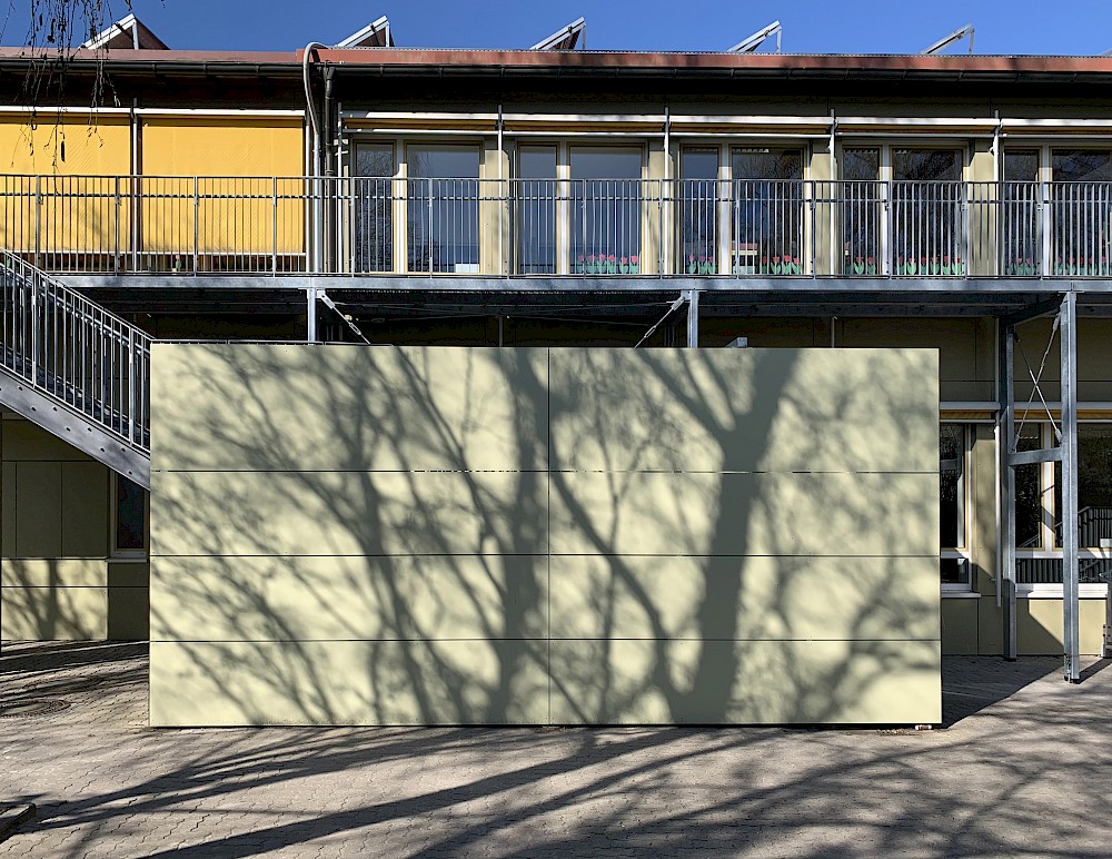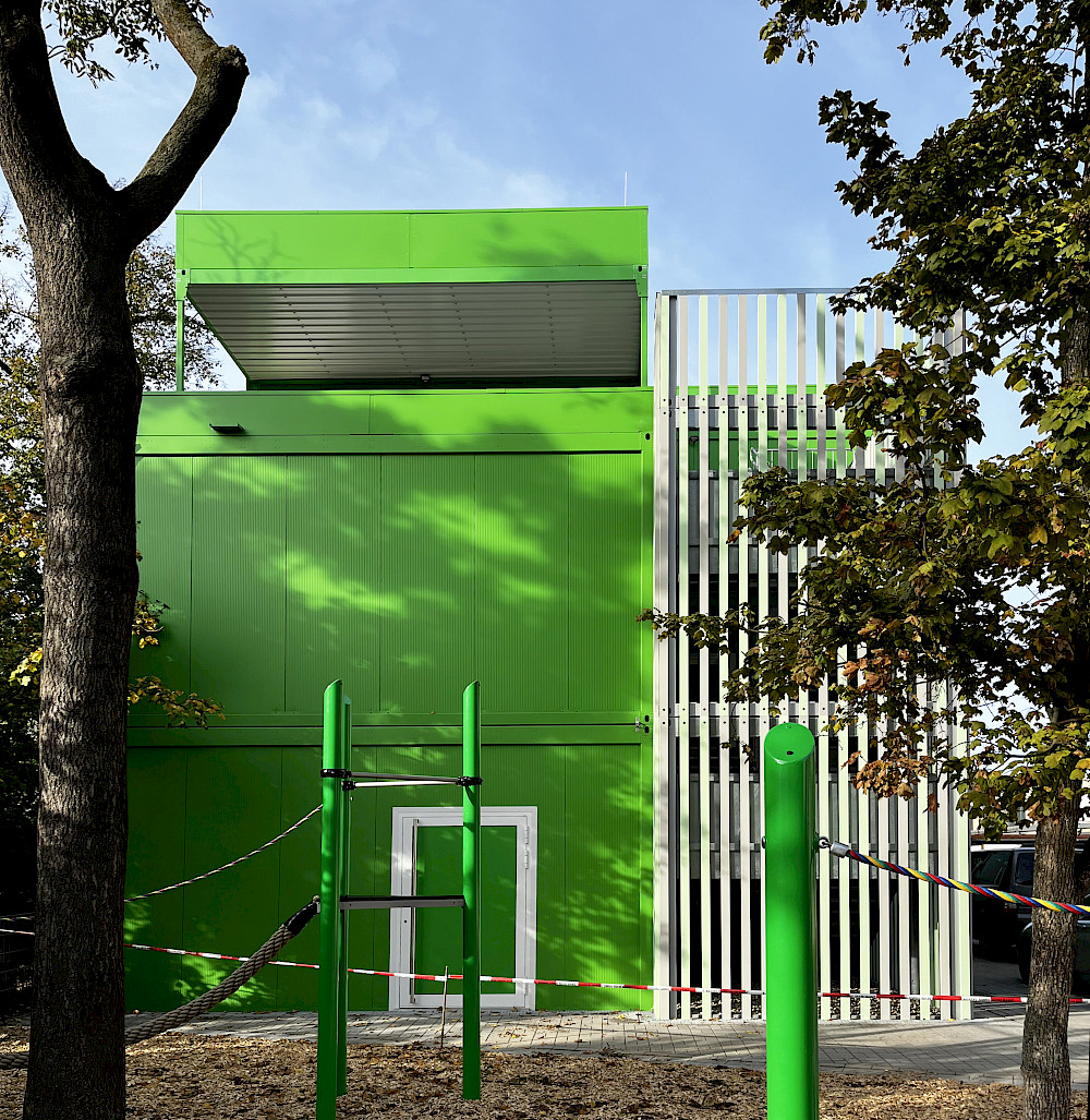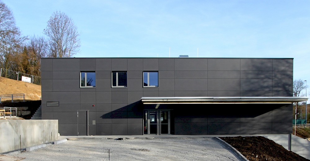 Das Gebäude liegt auf der Ebene des Fußballplatzes, durch die erhöhte Lage wird ein direkter Zugang zum Sportplatz und den Freiflächen gewährleistet.