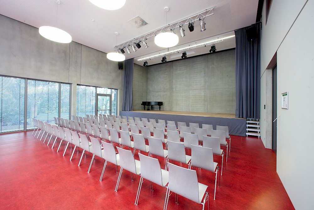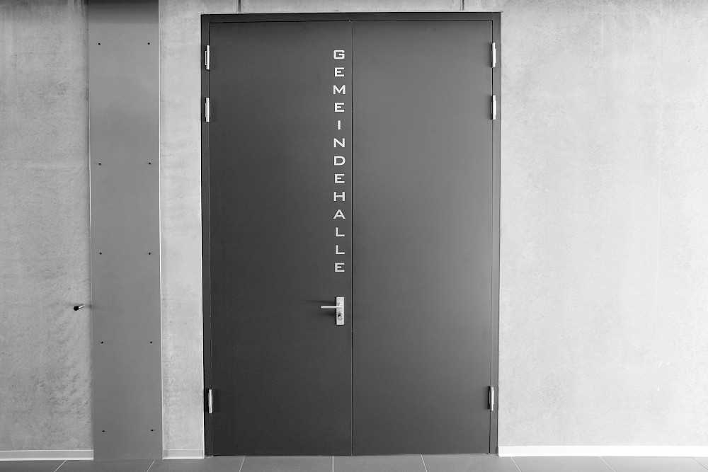 Die Gemeindehalle, ist ebenfalls im Erdgeschoss und dehnt sich über zwei Geschosse aus. Bei größeren Veranstaltungen kann die Halle auch durch die Vereine genutzt werden, da Halle und Vereinsheim direkt aneinandergrenzen.