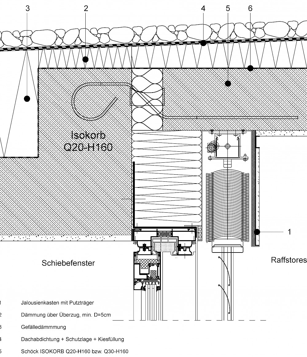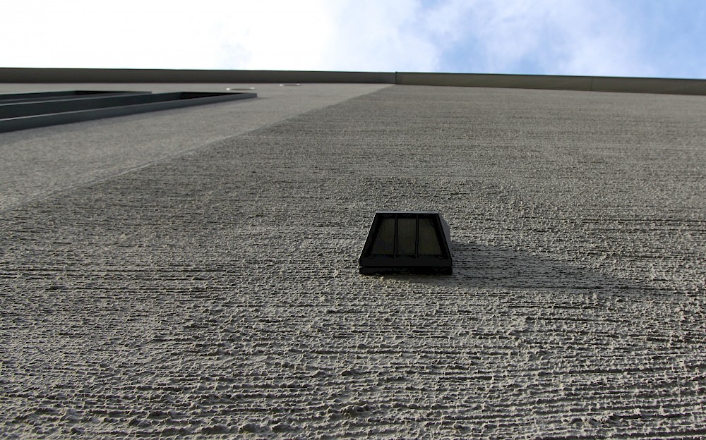 Die Gebäudehülle ist geradlinig, kompakt, ohne Gebäudeversprünge und hat ein durchgehendes Dach.