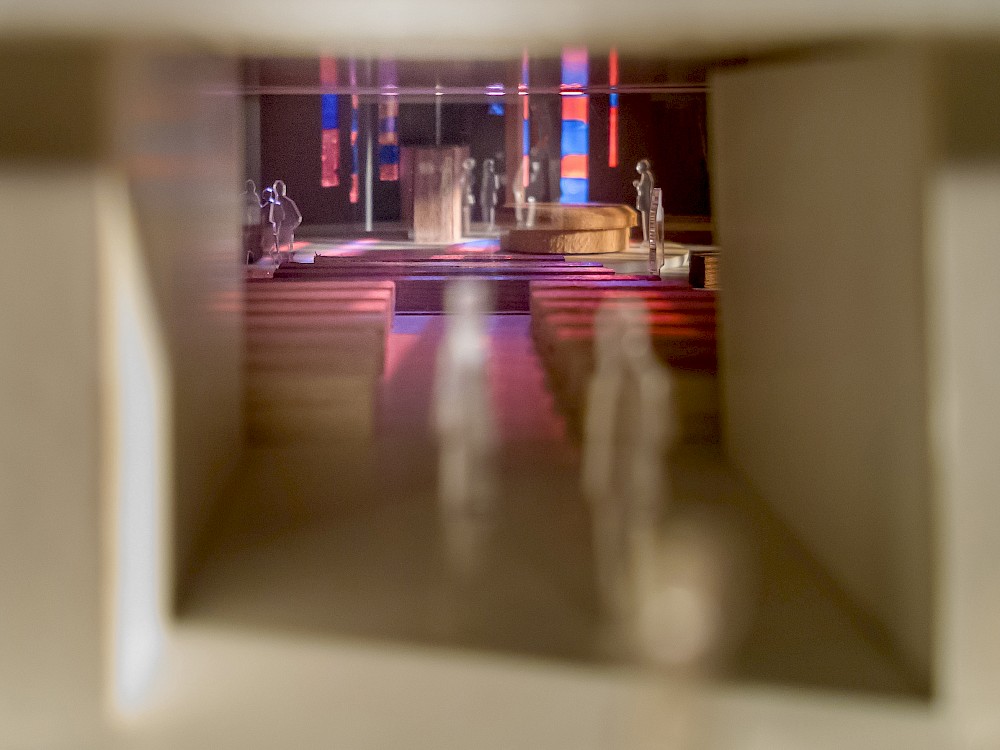 An der Schnittstelle, die durch den Abriss des Gemeindezentrums entsteht, wird ein weißer ruhiger Kubus eingeschoben. Die Architekturqualität des Kirchenraums wird in Szene gesetzt und gleichzeitig ein großer Mehrwert erzeugt. Die Gemeindemitte verändert sich zeitgemäß, wobei der Kirchenraum selbst vertraut bleibt