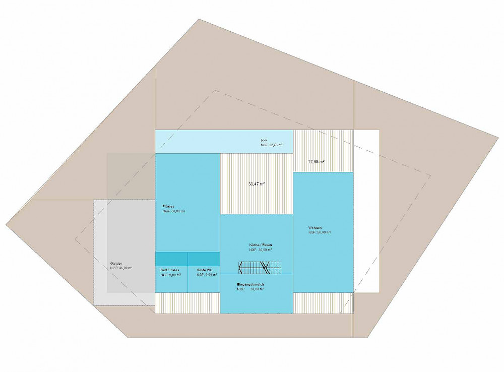 Im Erdgeschoss ist das Vereinsheim mit Nebenräumen geplant. Das Vereinsheim ist zum Sportplatz ausgerichtet. Die Freifläche zwischen Vereinsheim und Sportplatz kann als Freisitzbereich genutzt werden.
