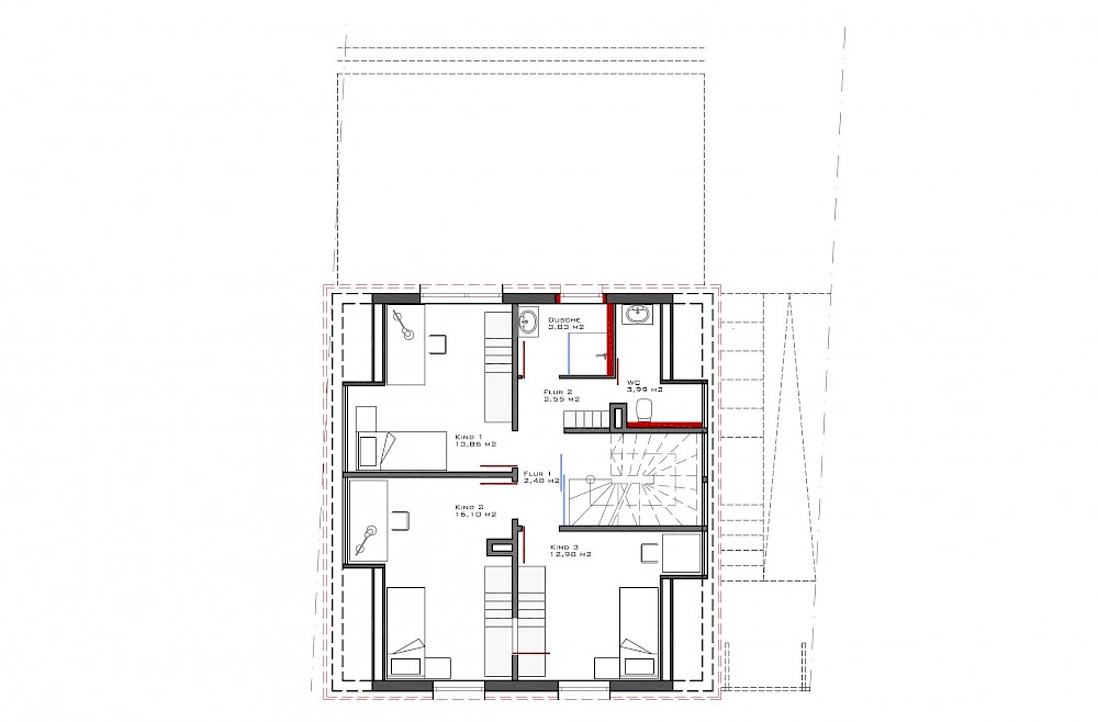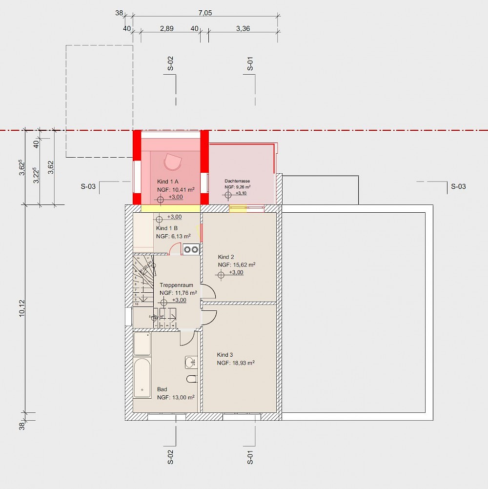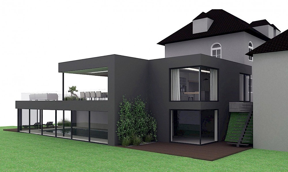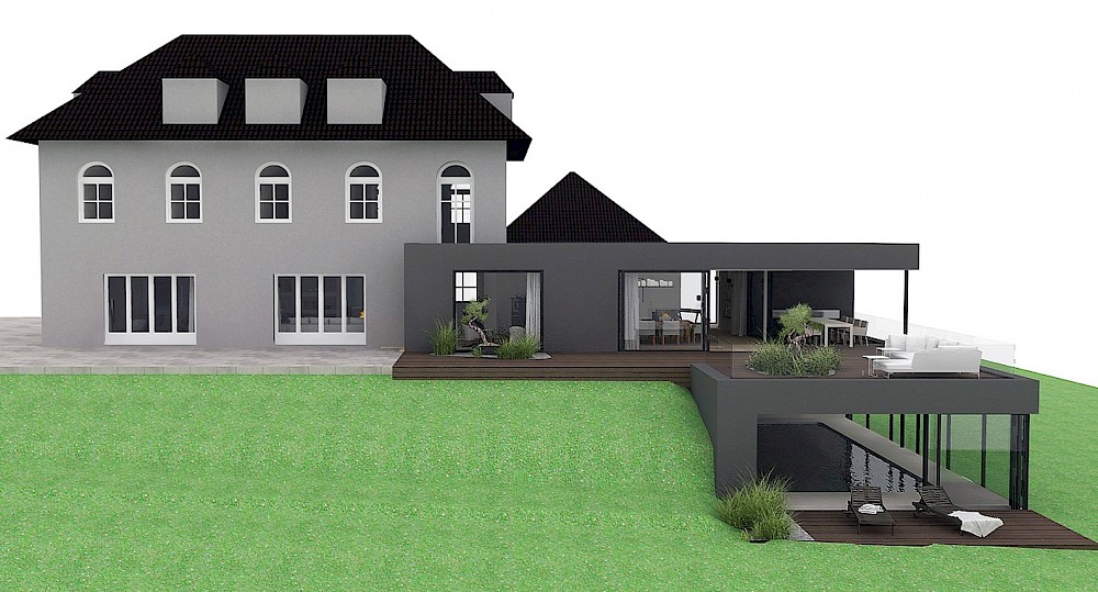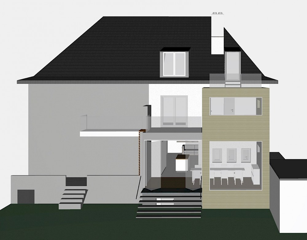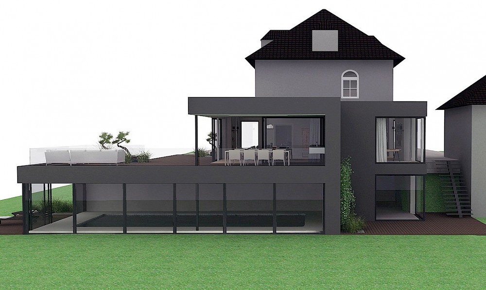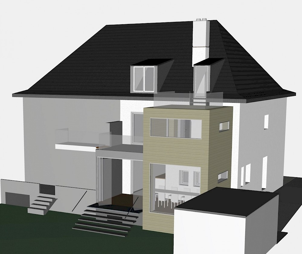 Das bestehende Gebäude wird auf der Nordseite im Erdgeschoss um einen Wintergarten / Essbereich und im Obergeschoss um 1 Kinderzimmer erweitert.