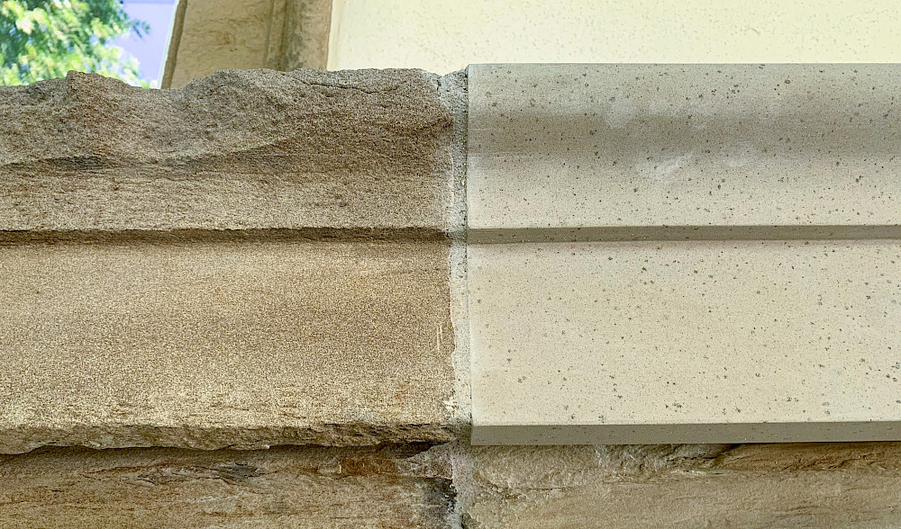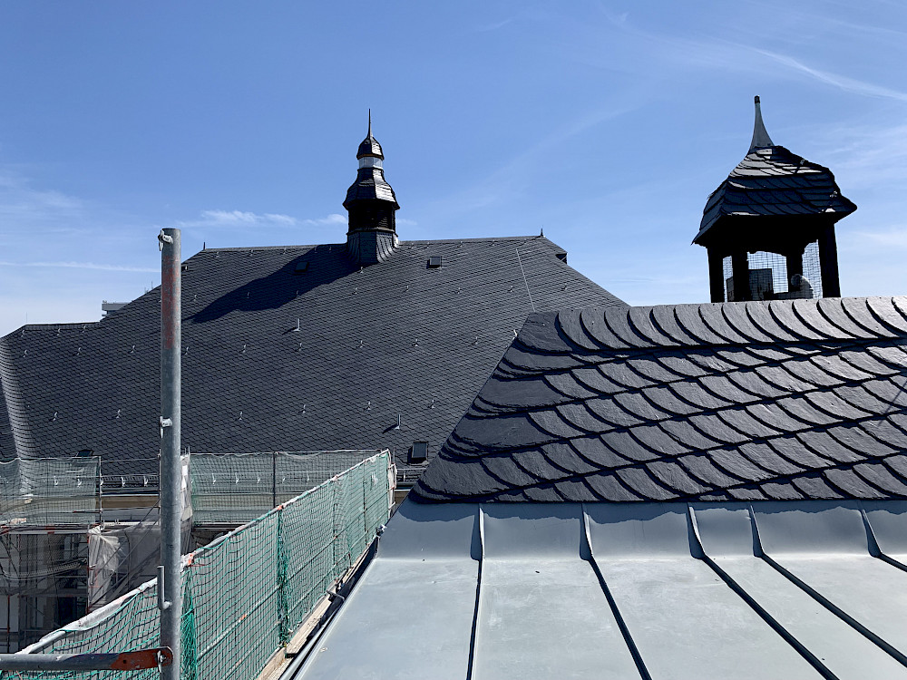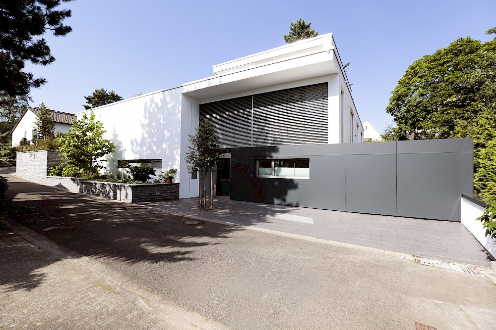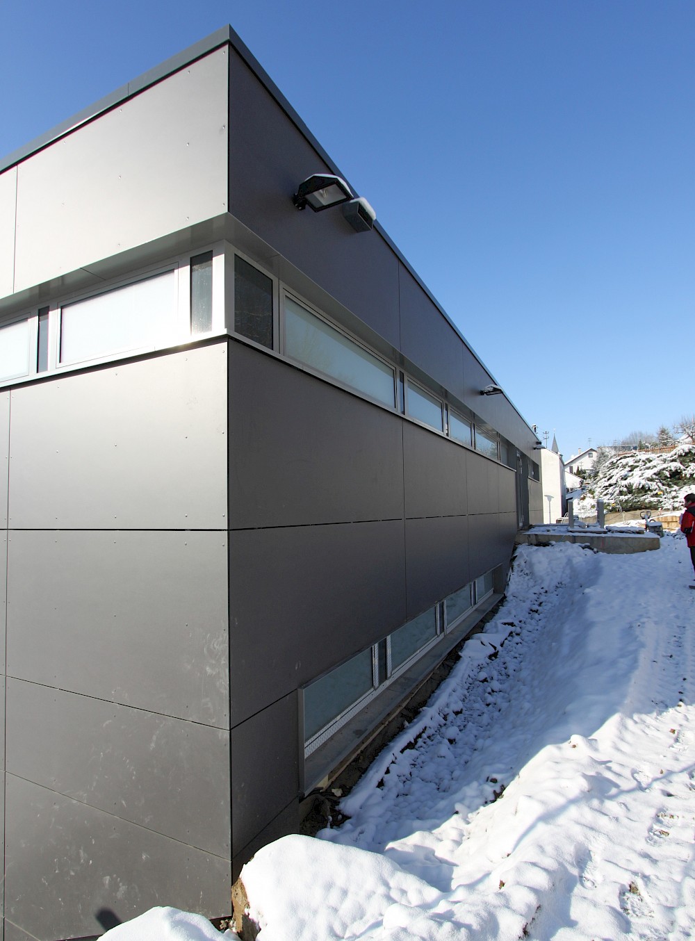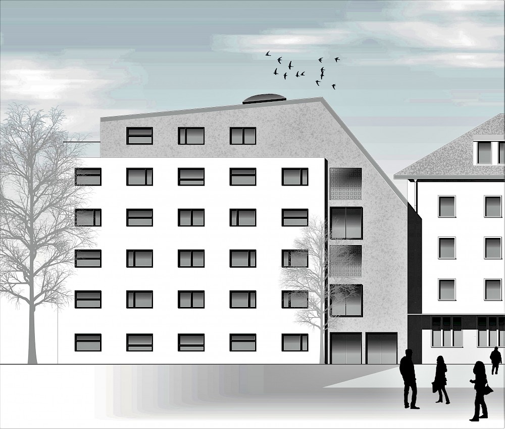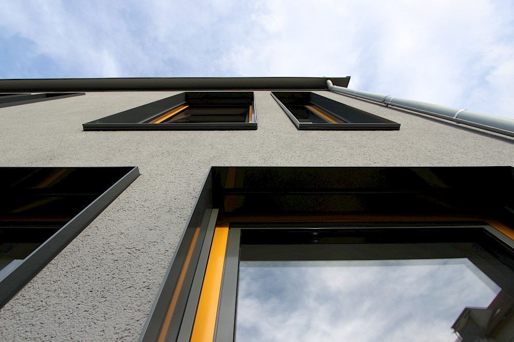 Der Neubau nimmt als Erweiterungsbau einerseits Elemente des vorhandenen Gebäudeteils auf (Fassadenfluchten, Höhenstaffelung, Dachform, Dachneigung, Traufhöhen),