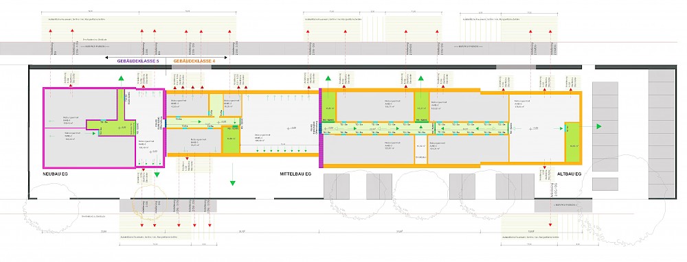 stellt sich andererseits durch Differenzierungen der Gebäudehülle (Wandoberflächen, Fassadengliederung, Dachflächen) bewusst als eigenständiger Gebäudeteil dar.