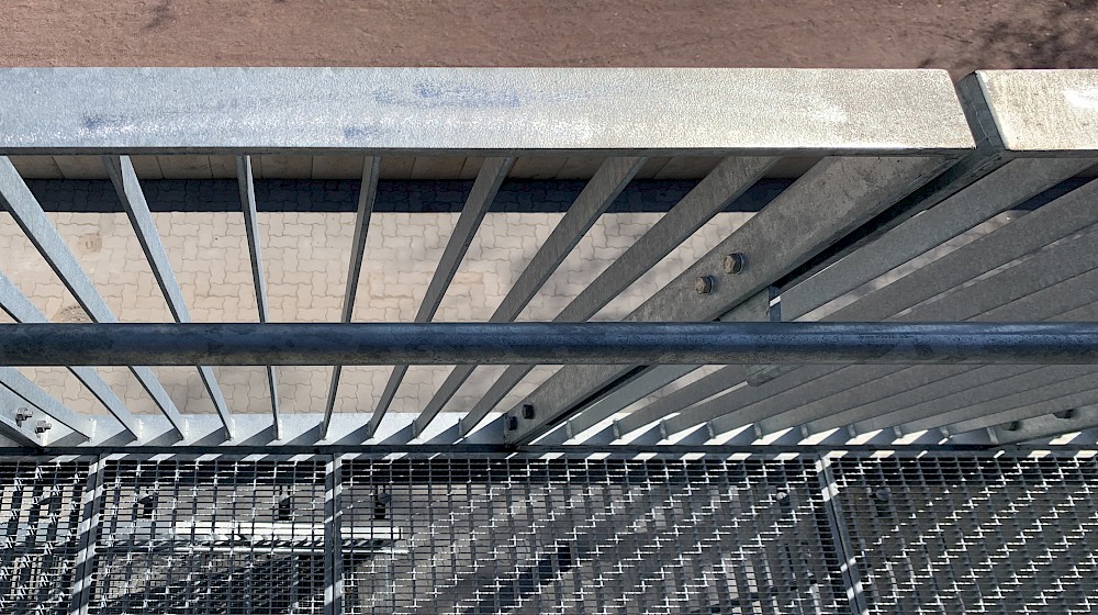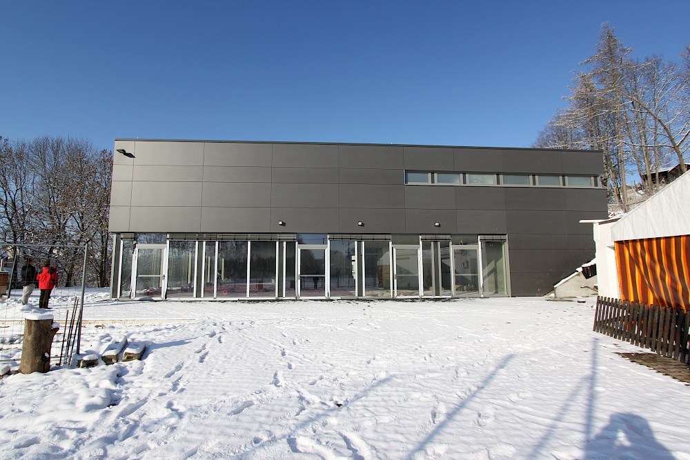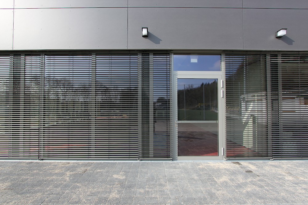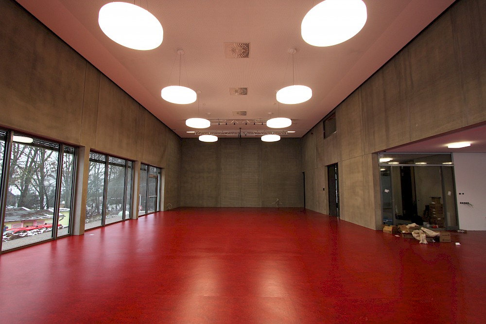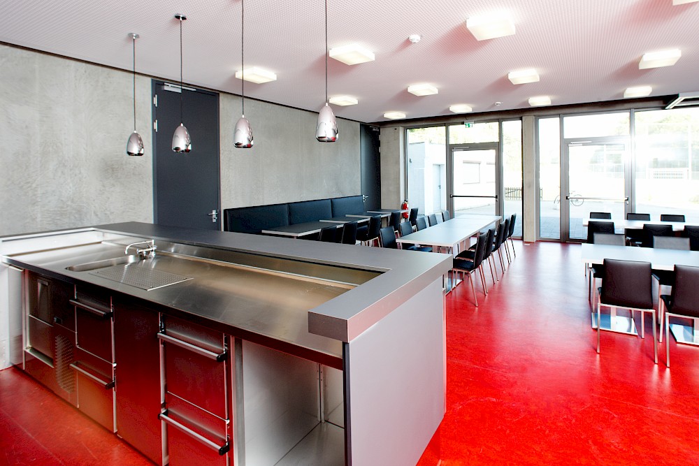 Das Gebäude liegt auf der Ebene des Fußballplatzes, durch die erhöhte Lage wird ein direkter Zugang zum Sportplatz und den Freiflächen gewährleistet.