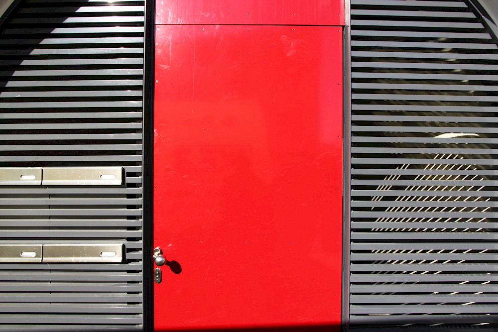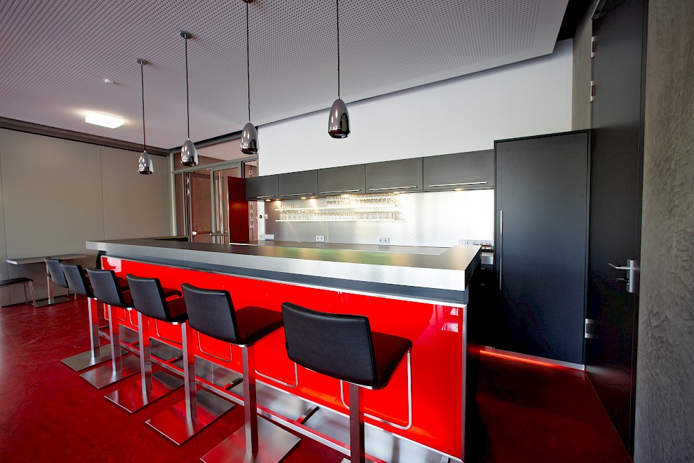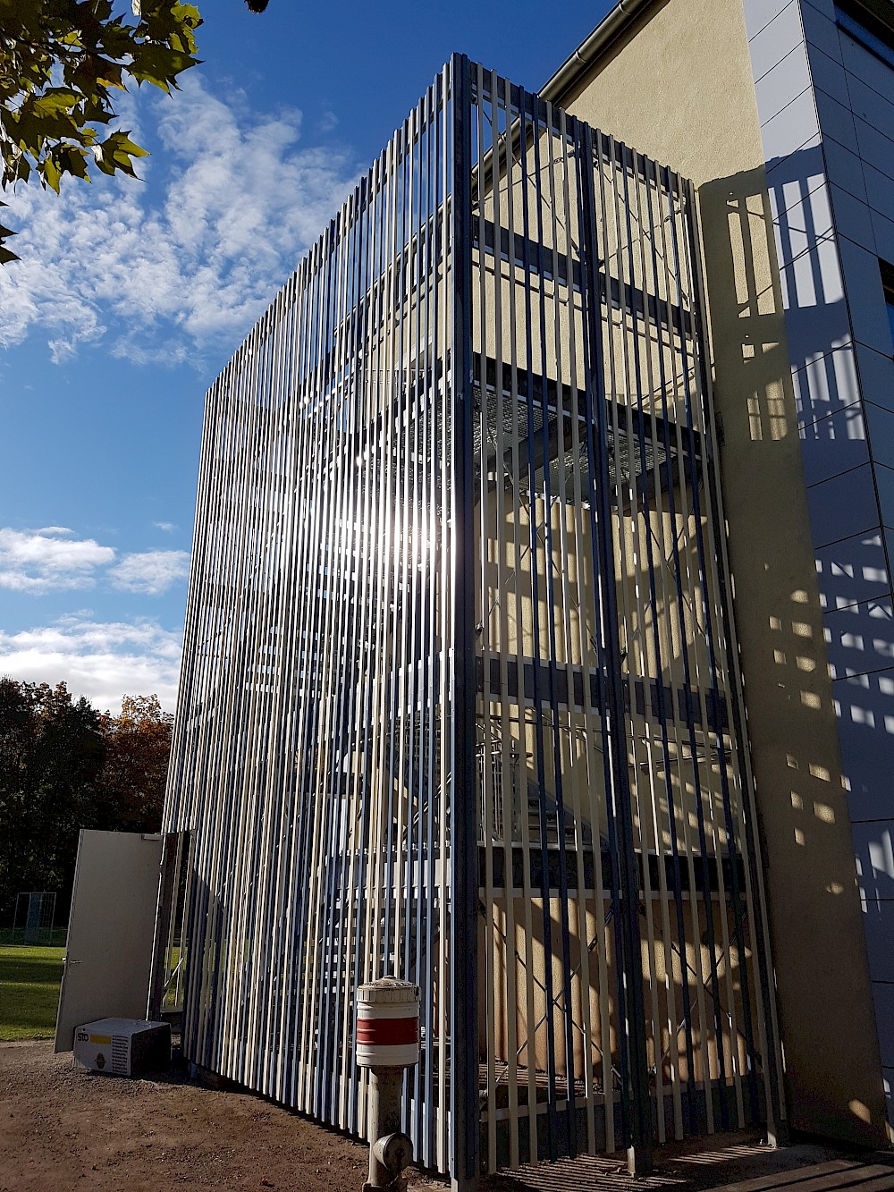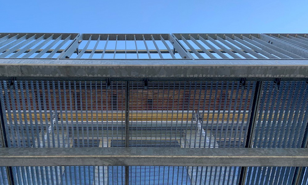 Das Gebäude liegt auf der Ebene des Fußballplatzes, durch die erhöhte Lage wird ein direkter Zugang zum Sportplatz und den Freiflächen gewährleistet.