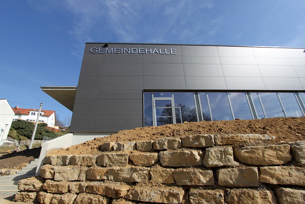 Die neue Gemeindehalle wird an Stelle des bestehenden Gemeindehauses errichtet. Die Gemeindehalle besteht aus einer großen Mehrzweckhalle über 2 Geschosse, einem Vereinsheim mit Gastronomieküche und Nebenräumen. Im Obergeschoss befinden sich die Sanitärräume für die Sportler und die Vereinsräume.
