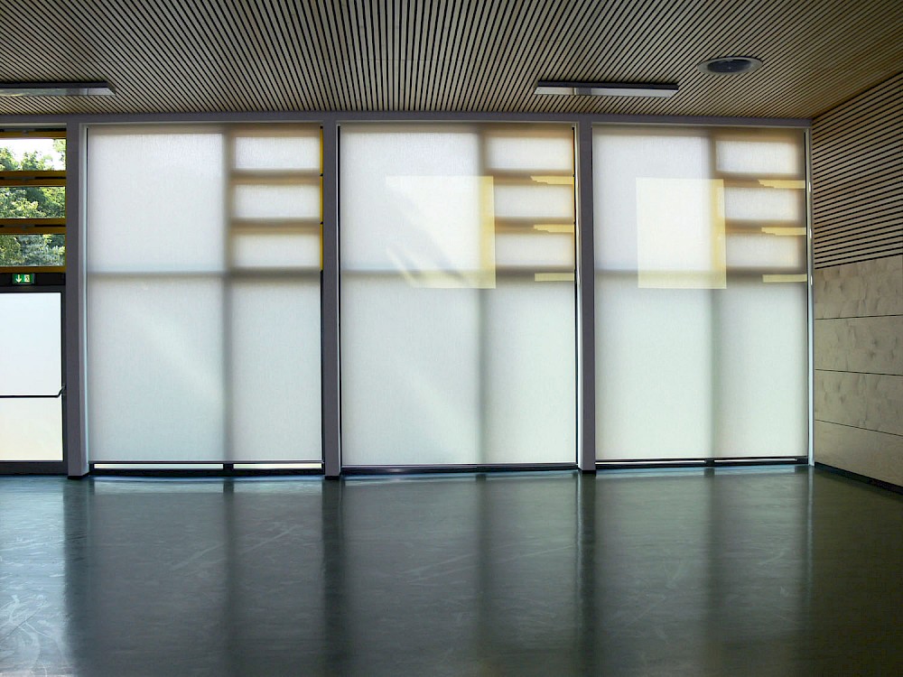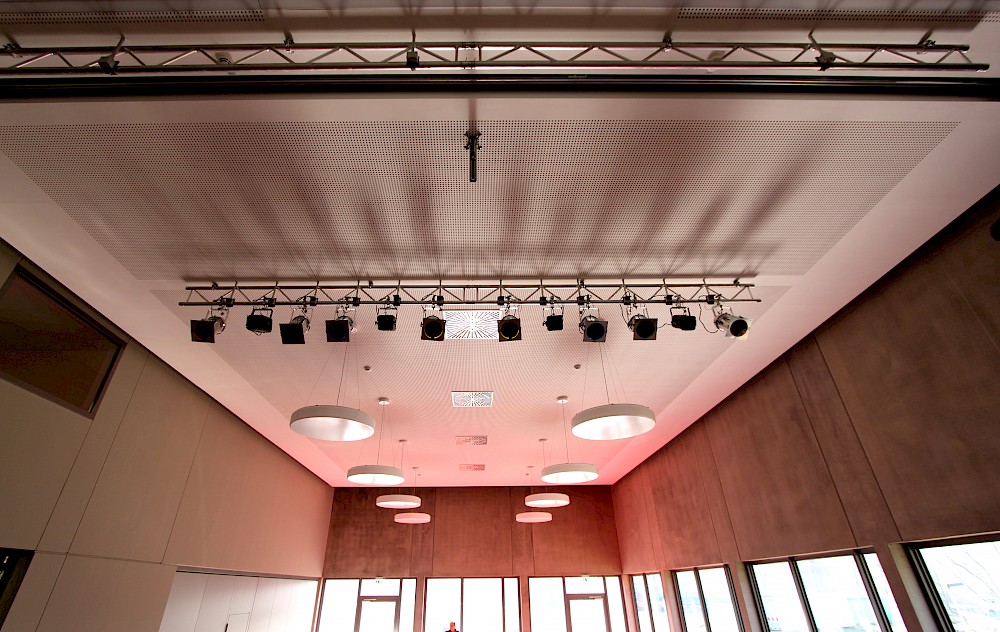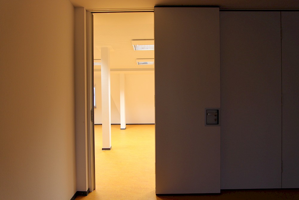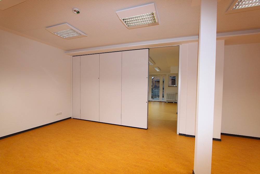 Die Gemeindehalle, ist ebenfalls im Erdgeschoss und dehnt sich über zwei Geschosse aus. Bei größeren Veranstaltungen kann die Halle auch durch die Vereine genutzt werden, da Halle und Vereinsheim direkt aneinandergrenzen.