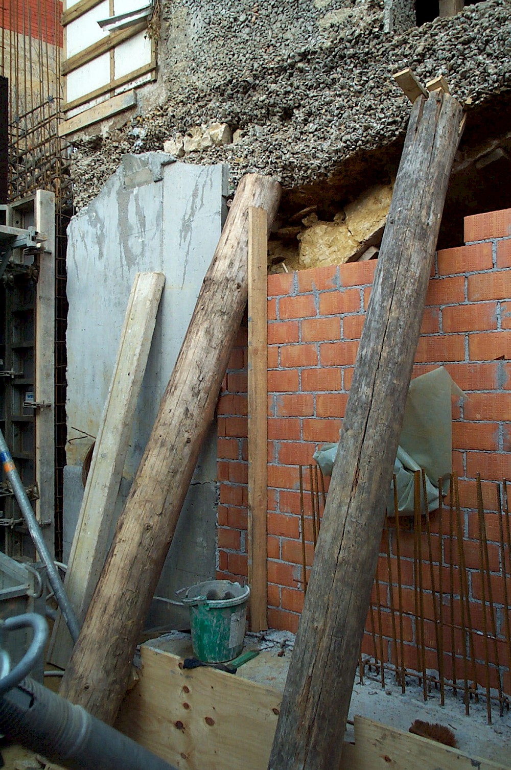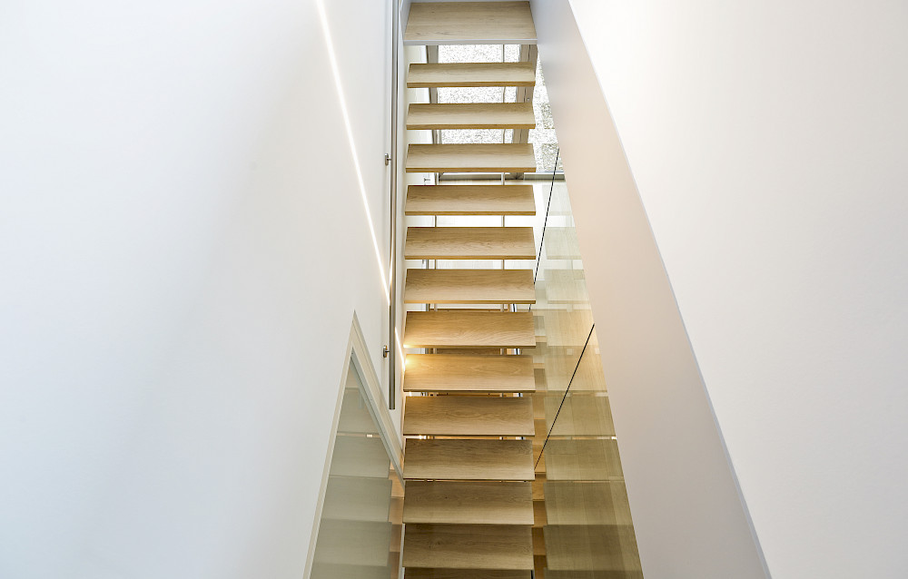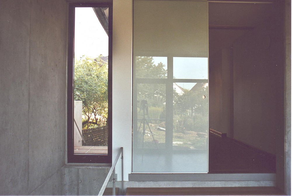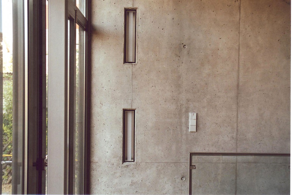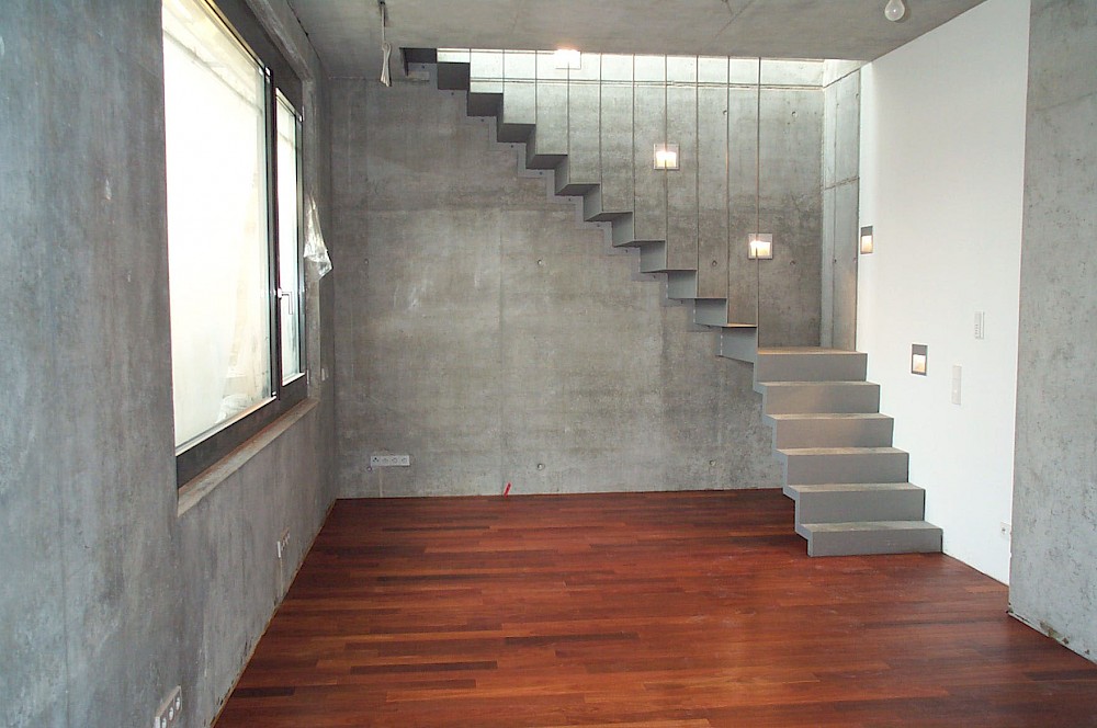 Der vorhandene Gebäudeteil wurde als Holzkonstruktion errichtet und ist der Hanglage entsprechend in vier halbgeschossige versetzte Geschossebenen gegliedert.