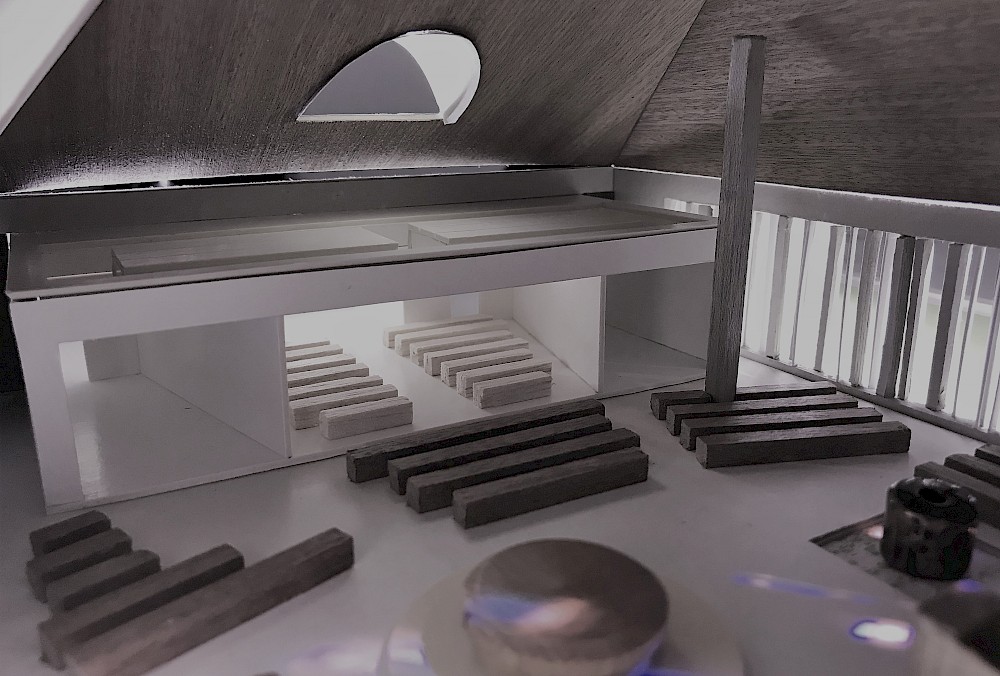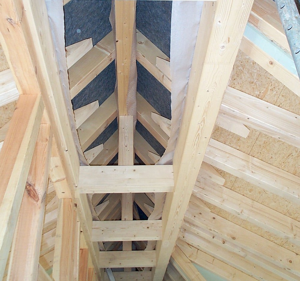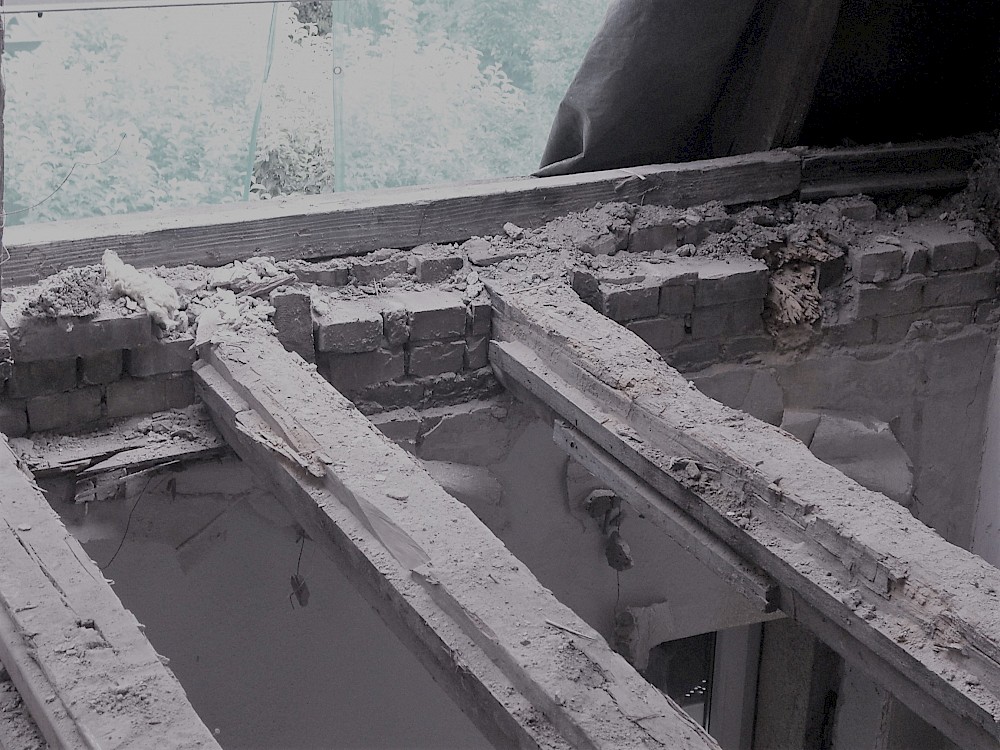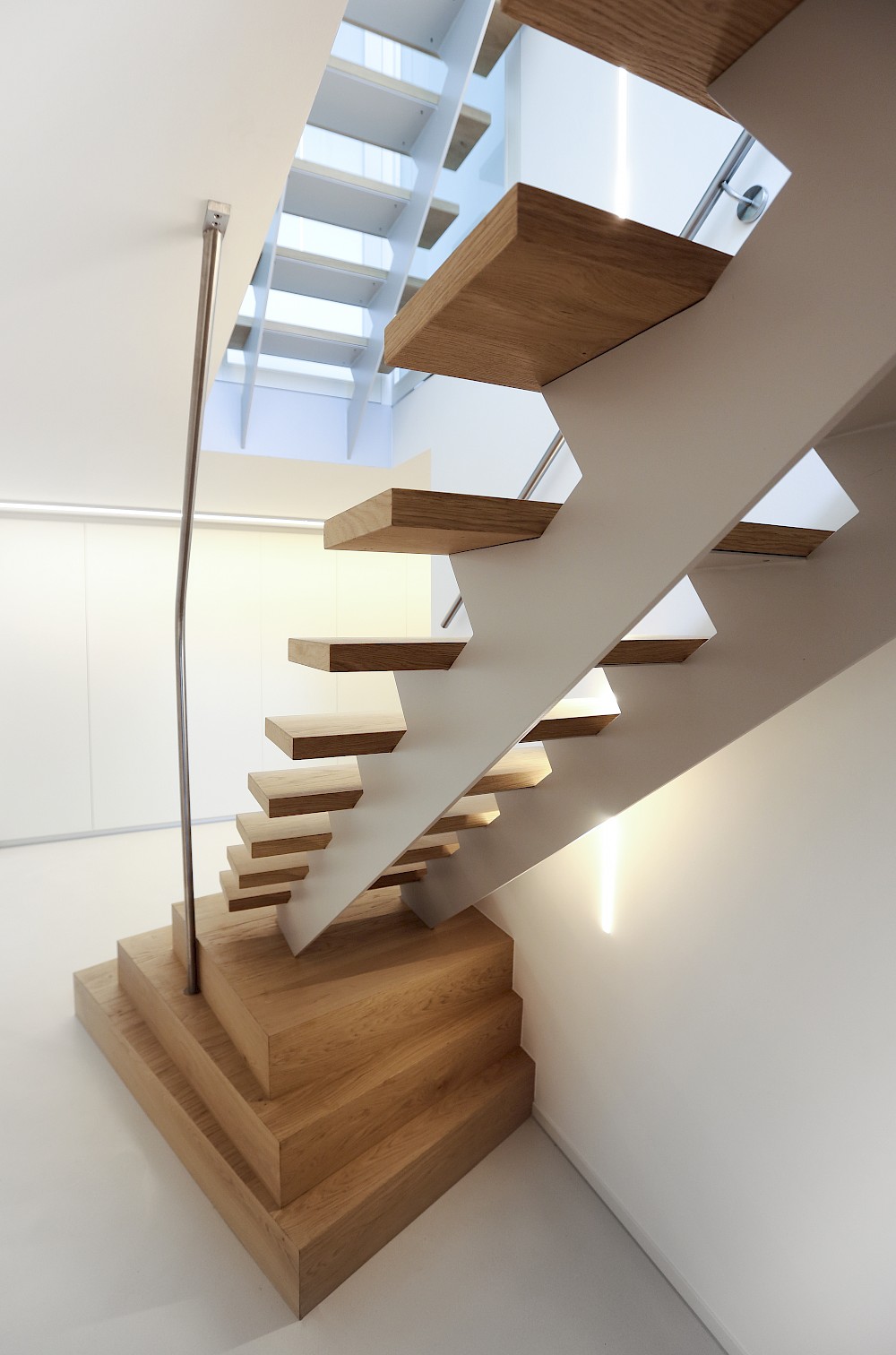 Der vorhandene Gebäudeteil wurde als Holzkonstruktion errichtet und ist der Hanglage entsprechend in vier halbgeschossige versetzte Geschossebenen gegliedert.