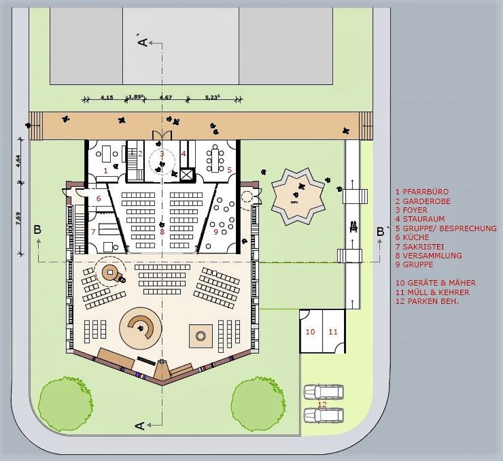 Neu ist ein zweiseitiger, gemeinsamer Zugang in der Fuge zwischen der Kirche und der Nachbarbebauung, sodass Kirche und Umfeld voneinander profitieren und das "neue Gemeindeleben" gestärkt wird. Der neue Eingang der Kirche liegt auf ihrer Mittelachse.