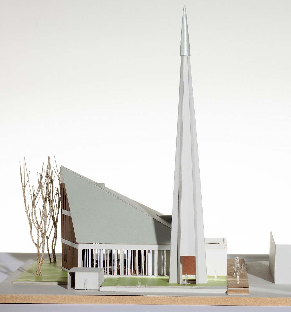 Die prägnante Christuskirche in Speyer wird vorsichtig verkleinert, die Funktionen des Gemeindezentrums werden ergänzt