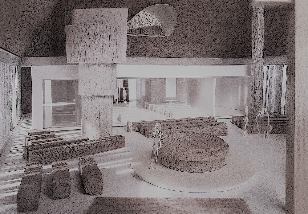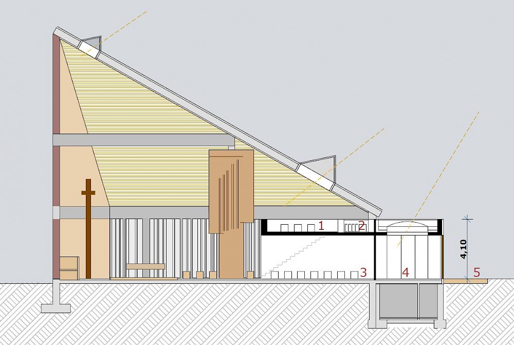 An der Schnittstelle, die durch den Abriss des Gemeindezentrums entsteht, wird ein weißer ruhiger Kubus eingeschoben. Die Architekturqualität des Kirchenraums wird in Szene gesetzt und gleichzeitig ein großer Mehrwert erzeugt. Die Gemeindemitte verändert sich zeitgemäß, wobei der Kirchenraum selbst vertraut bleibt