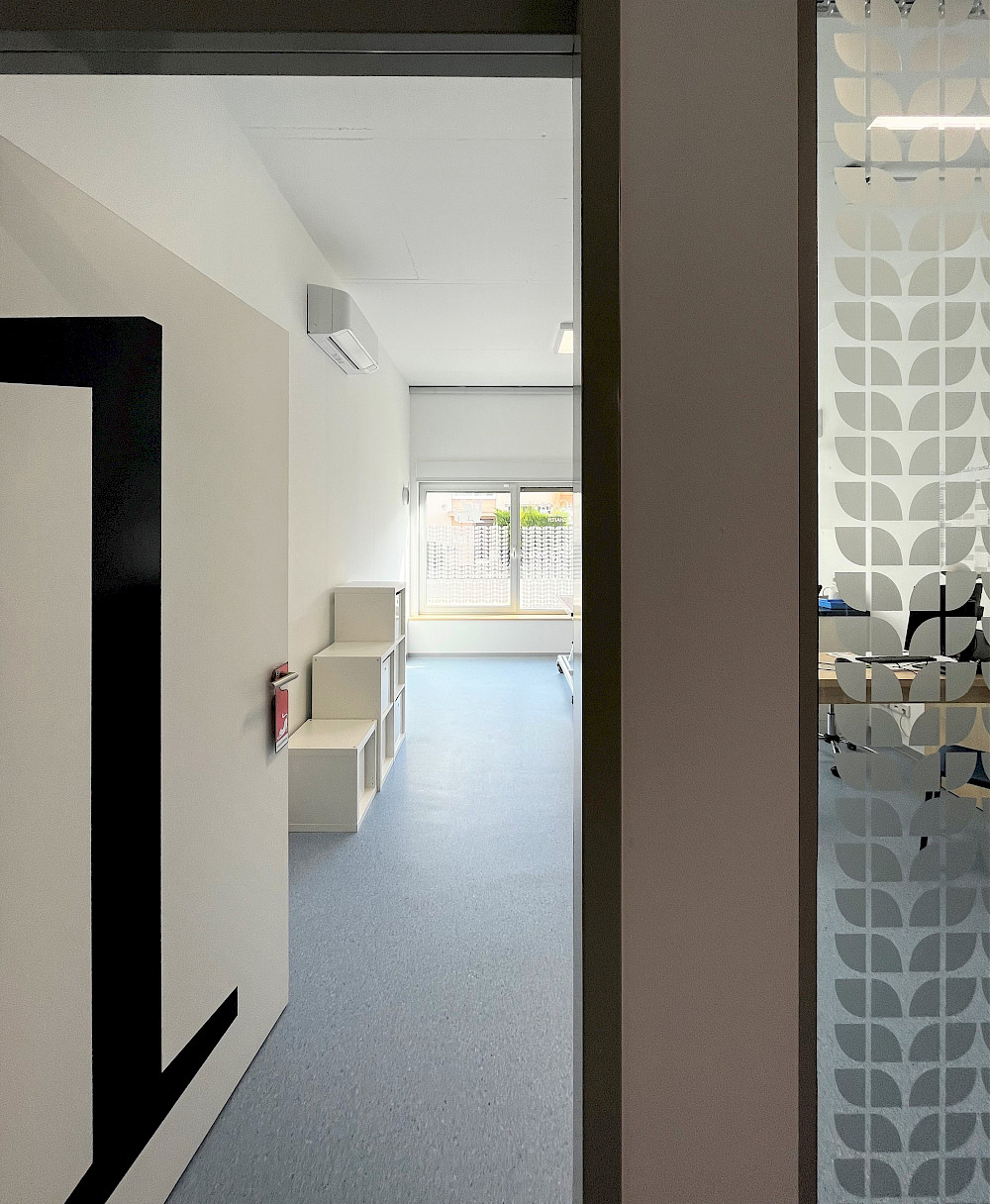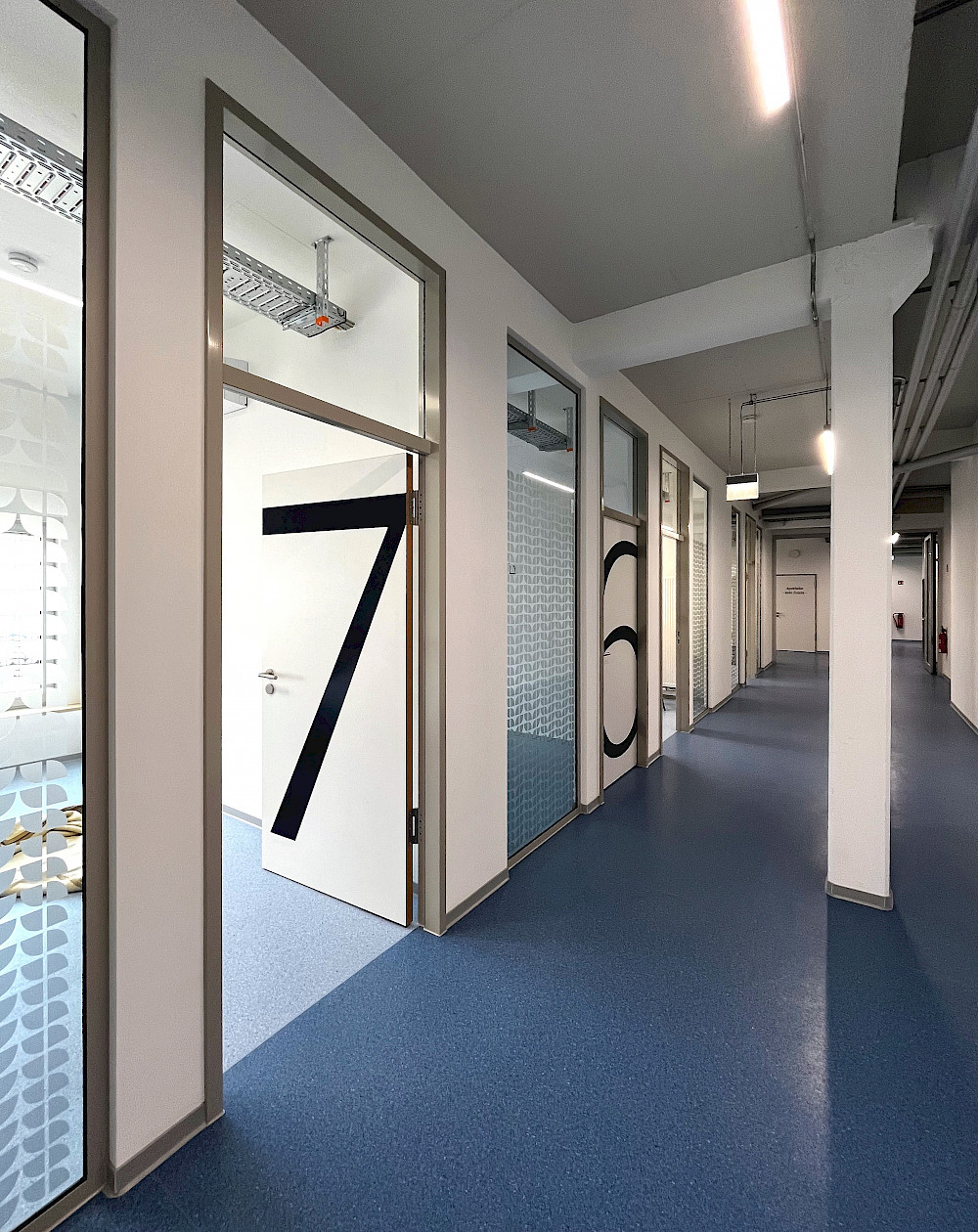 Die innere Erschließung durchzieht die drei Gebäudeteile über unterschiedliche Höhenniveaus, was sie zusammenstrickt und funktional verzahnt. Im Erdgeschoß sind Zonen zur gemeinschaftlichen Nutzung verteilt wie Arbeitsräume, Gemeinschaftsküche, Lounge, Café, Sportbereich und Freibereich. Es bildet sich eine neue, bunte Adresse mit zeitgemäßem Image: ANUNDO Hafen.